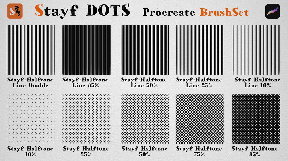 Stayf Dots are Halftone brushes for the iPad app Procreate. The Brushset has 20 halftone brushes. The brushes are in percentages. You can use the brushes in the same file and build up gradients from 10% to 85% patterns. The dot patterns are set to the screen. When you change the angle of the screen you can use different colors creating a Ben Day Dots effect. There are line halftones and dot halftones in this BrushSet. Apart from the halftones the original Ben Day Dot pattern brush is also included.