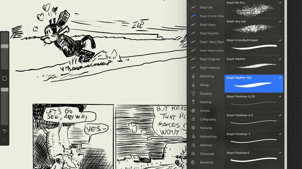 The Stayf Comic Ink Brushes are made to use in Procreate. In the BrushSet are 14 brushes based on traditional sable brushes, crow quill pens, dip pens and fineliners. With this set you can ink in any comic style you want. I studied the characteristics of the analog brushes and pens and translated them into digital brushes.
