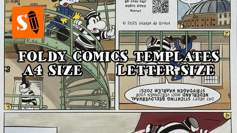 Foldy comics are made out of one piece of paper. There is the Five Page Foldy Comic and Four Page Foldy Comic. Download the templates here and start creating your own Foldy comic on paper or digital.